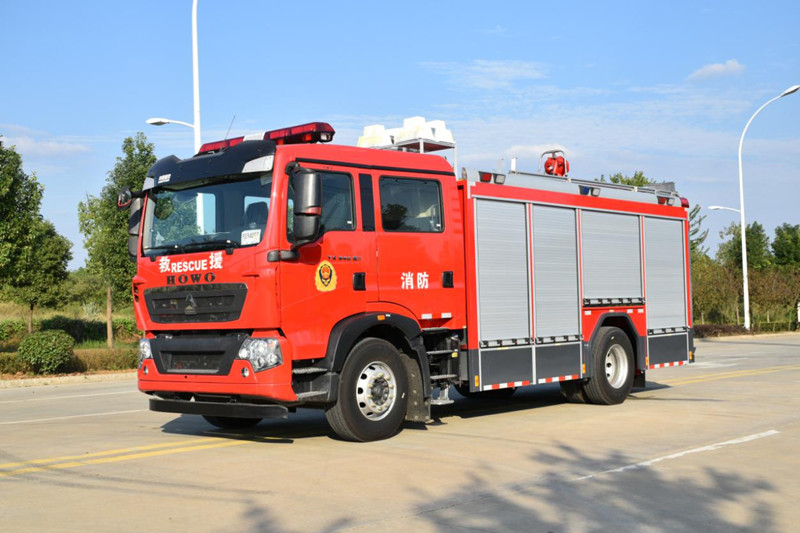 我公司生產(chǎn)的T5G單橋城市主戰(zhàn)消防車采用中國重汽集團濟南卡車股份有限公司生產(chǎn)的ZZ5207TXFV471GF5型二類汽車底盤, 該車原裝雙排駕駛室,可載含駕駛員在內(nèi)的乘員6人,駕乘舒適輕便。該車采用DC-CAFS60/45M型集成壓縮空氣泡沫滅火系統(tǒng),該壓縮空氣泡沫系統(tǒng)操控簡易,泡沫生成實現(xiàn)即時全自動微機精確調(diào)控,并設(shè)多重保護與報警系統(tǒng),消防作戰(zhàn)員可依據(jù)復(fù)雜的火場情況,方便地借助按鈕選擇干泡沫、濕泡沫等不同類型的泡沫滅火方式。該套系統(tǒng)不僅裝有A類泡沫原液,還裝有B類泡沫原液,可高效率地撲滅和控制A、B類物質(zhì)火災(zāi),并具備良好的環(huán)保性能。另外該車配置有牽引電動絞盤,7.6米氣動升降舉升4*1000w照明燈和10.5kw車載發(fā)電機,使得該車還可獨立開展偵查、破拆、救生、照明、防護等綜合搶險救援功能。